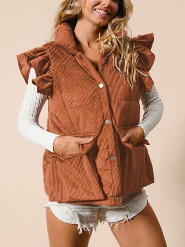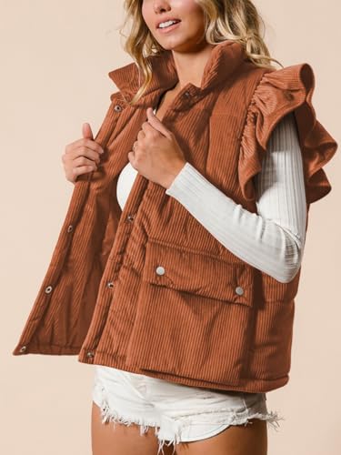 sizzling ! Womens Corduroy Puffer Vest Ruffle Sleeve Winter Snap Button Coats Padded Gilet with Flap Pockets