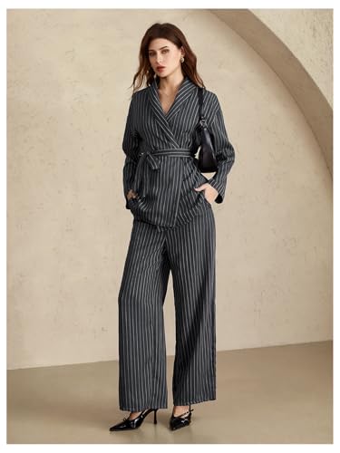 Fabric type: 97% Polyester,3% ViscoseCare instructions: Machine WashOrigin: ImportedMaterial: Fabric has no stretch, but it is supple and skin friendlyFeatures: Striped print, shawl collar, long sleeve, drop shoulder, belt, loose fit, suit jacket, wide leg pants, 2 piece setOccasions: Suit for business meeting, cocktail, banquet, job interview, speech, presentation, client lunch, seminar, and other formal eventsMatch: This elegant outfit can be dressed up with high heels, flats, sandals, clutch purse for a professional lookSize recommendation: Please refer to size chart which we provide in our photos (The product measurement is clothes size, NOT body measurement) Perfect for everyday use. premium materials and excellent craftsmanship ensure long-lasting durability.