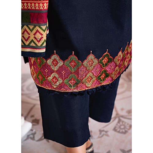 • Description : Salwar and kameez is pure cotton fabric/bandhani Cotton, Pure Jam Satin And Daman Embroidery, simmer || Bottom :- Pure Lawn Dyed , Dull Santoon || Dupatta : Pure Lawn Mul-Mul Box Pallu Digital print is tender mal cotton and bandhani cotton in matching printed combination, Casmos Digital with Work with bottom in plain cotton fabric in pants/patiyala/churidar style. || Size :- Max up to 58" Inches || Type :- Ready to Wear ||