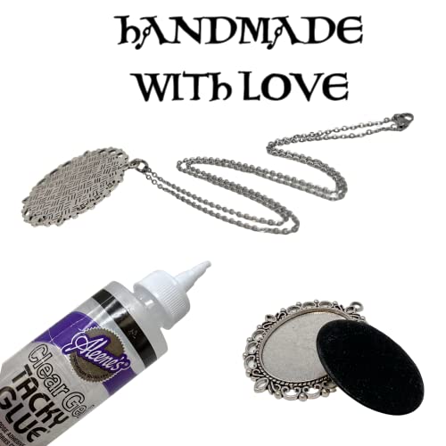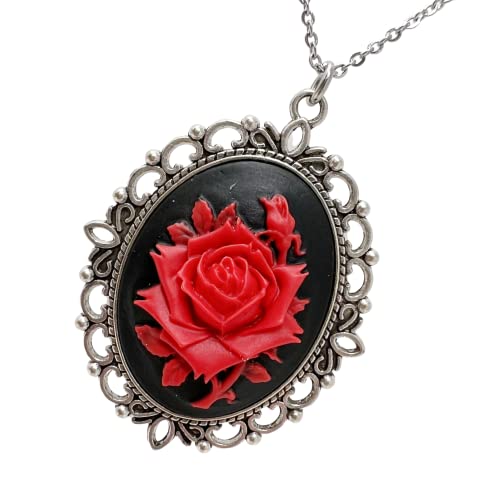 • Antique silver, goth style pendant setting is about 2-1/4" x 1-3/4" with red rose on black resin. Necklace chain is 24" long, stainless steel color, lead and nickel safe.