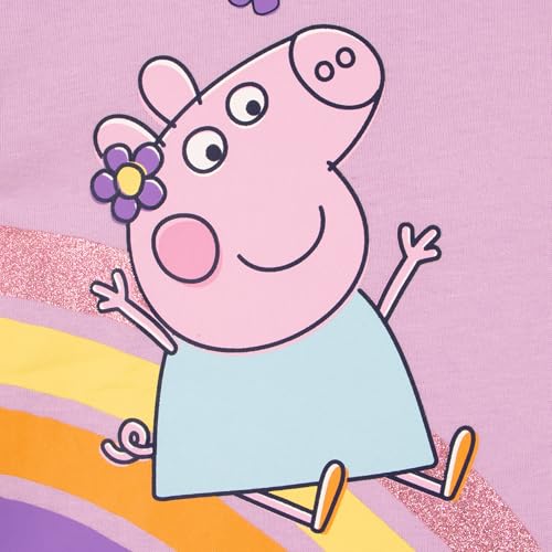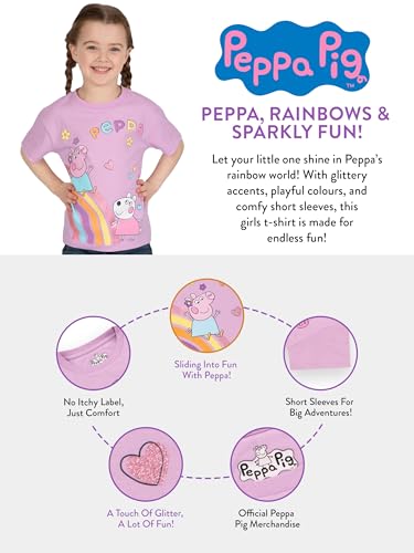 Fabric type: 100% CottonCare instructions: Machine WashOrigin: ImportedClosure type: Pull OnRainbow Adventures With Peppa: Brighten up her day with this cute Peppa Pig shirt featuring Peppa sliding down a glittery rainbow with her friend Suzie! outstanding for sunny days filled with play, this girls top brings the whimsy of Peppa's world right into her Peppa Pig clothesVibrant Design: With colourful lettering and a lively background of flowers and hearts, this Peppa Pig tshirt captures the spirit of fun and friendship that Peppa embodies. Itβs not just a girls tshirt; it's a piece of the playful Peppa universeComfort Meets Style: Crafted with 100% cotton, this shirt for girls gives comfort during all her activities during the day. Whether she's at a Peppa Pig party or playing in the park, she'll feel cool and comfy all day longShort Sleeves To Keep Cool: This cute girls short sleeve shirt will keep your little one ready for a adventure with Peppa, Suzie and even George. The short sleeve on the Peppa Pig t shirt keeps them cool during summer and creates a cute Peppa Pig outfit. This purple Peppa Pig top makes an ideal addition to any Peppa Pig clothes for girlsCute Peppa Pig Gifts For Girls: Looking for birthday gifts for girls, cute girls shirts, girls t shirts or girls tshirts for a Peppa fans? This t-shirt is a wonderful gifts for kids that gives both style and practicality, making it a great choice for pairing with Peppa Pig toys Perfect for everyday use. premium materials and excellent craftsmanship ensure long-lasting durability.