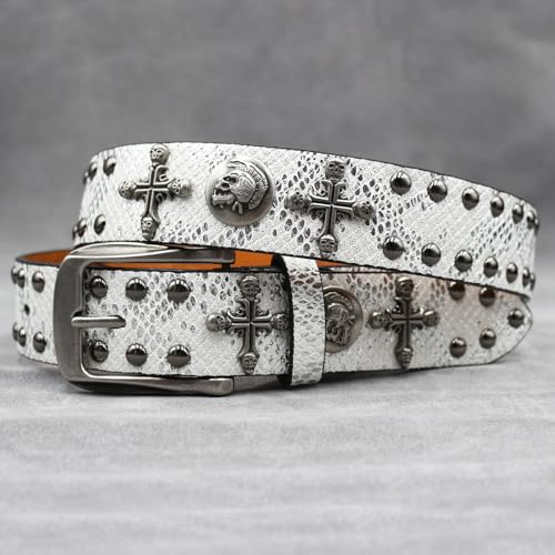 sizzling ! Western Studded Belt for Women Men, Engraved Cross Skull Head Round Rivet Shining Sequin Leather Punk Waist Strap(105cm/41, White)