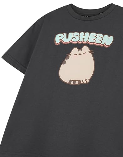 Pusheen Girls Grey Short Sleeved T-Shirt | Blush Cartoon Graphic Tee for Kids | Children's Cute Cat Apparel Top