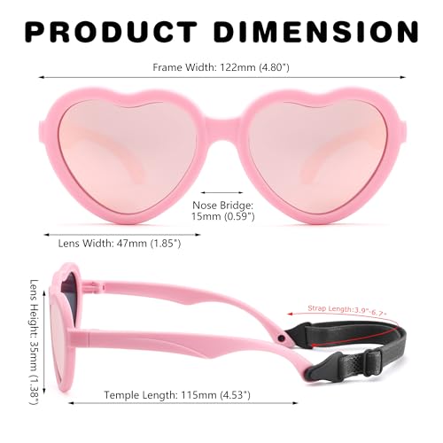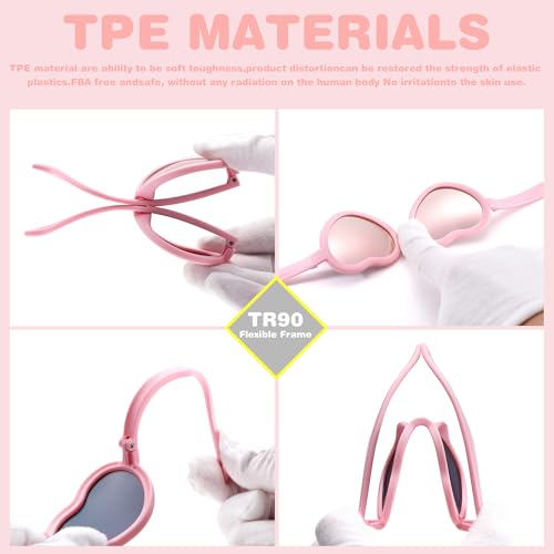 Hycredi Kids Heart Sunglasses for Girls - TPEE Rubber Flexible Toddler Polarized Sunglasses with Strap Age 2-8