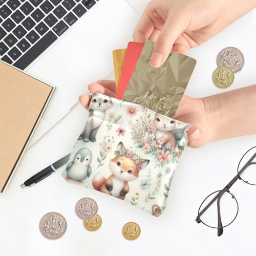 Pastel Animal Flowers Coin Purse Leather Pouch Change Purse, Squeeze Coin Pouch for Cards, Keys & Lipsticks, Unisex