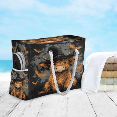 Large Beach Bags Totes Canvas Tote Shoulder Bag Highland Bull Bat Water Resistant Bags for Gym Travel Daily