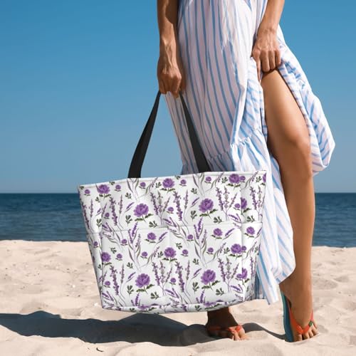 Large Beach Bags Water-resistant Sandproof - Lavender Flowers Fujiman Cute Beach Tote Bags for Women with Zipper
