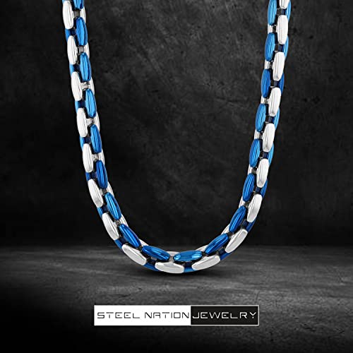 Item display length: 24 inchesMaterial: MetalMetal type: Stainless SteelClasp type: LobsterChain type: LinkGem type: No GemstoneBOLD IN BLUE – Put the finishing touch on your look with this polished two-tone stainless steel link chain necklace. It measures 24” long and easily fastens with a secure lobster clasp. The design features a pattern of steel tone and blue links. Grab this eye catching necklace today and say hello to the signature piece you’ve been looking for.MADE TO IMPRESS – Located in the heart of downtown LA, Steel Nation specializes in trend-right fashion and fine jewelry for men, including rings, wedding bands, bracelets, chains, and other accessories. All of our pieces are made to be both handsome, to help you stand out from the crowd, yet durable enough to withstand whatever life throws at you. Our premium jewelry is guaranteed to last with quality craftsmanship you can trust.STRENGTH and BEAUTY – Steel Nation specializes in durable, attractive jewelry made from stainless steel (will change with the piece), which is anti-corrosive, hypoallergenic, and tarnish-free. We also offer pieces meticulously crafted from alternative metals like tantalum carbide, titanium, tungsten, and cobalt, in addition to sterling silver and gold. This ensures you find the perfect piece to match your taste and lifestyle.MODERN GIFTS FOR HIM – Give the men in your life the perfect gift for a holiday, special event, or celebration from Steel Nation. Jewelry makes a meaningful and practical present for your boyfriend, husband, dad, son, brother, grandson, or best friend. Every stylish piece from Steel Nation Jewelry comes in a giftable box, ready to present to him for an engagement, birthday, anniversary, Christmas, Father’s Day, or Valentine’s Day.COMMITTED TO YOUR SATISFACTION – As a small business, we value our customers. Steel Nation stands behind every piece we offer as a manufacturer of high-quality jewelry. If you’re unhappy with your purchase, please let us know, and we’ll work to make it right. Perfect for everyday use. High quality materials and excellent craftsmanship ensure long-lasting durability.