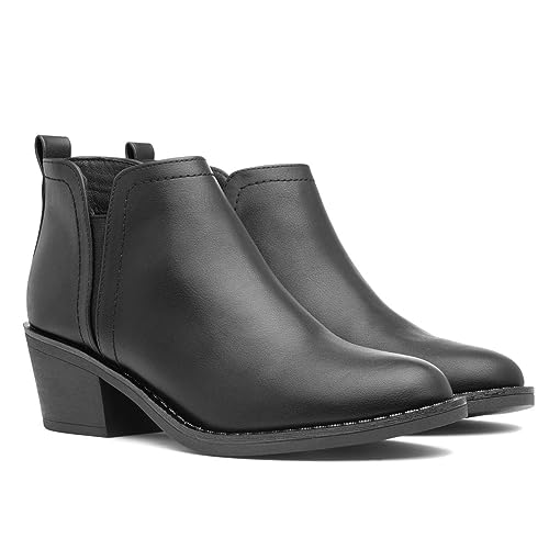 Origin: Made in the USA or ImportedSole material: RubberShaft height: AnkleShaft circumference: 11.75 InchesStyle: Slip on bootieUpper: Black faux leatherLining: MicrofiberSole: Rubber with chunky stacked heelHeel height: 2.2 inches outstanding for everyday use. premium materials and excellent craftsmanship ensure long-lasting durability.