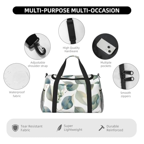 ThisEucalyptus Leaves Print travel duffle bag measures 50x33x26 cm (19.7x13x10.2 inches), offering ample space to accommodate clothes, electronics, and daily essentials. for weekend getaways, gym workouts, or even as an airplane carry on.Crafted from sturdy twill fabric and polyester, this hand travel bag is built to withstand the rigors of travel. TheEucalyptus Leaves Print robust material ensures longevity while maintaining a sleek and sophisticated appearance suitable for various occasions.Featuring a smooth nylon zipper with dual pull tabs, thisEucalyptus Leaves Print large tote bag ensures easy and reliable opening and closing. The zipper operates effortlessly, providing quick access to your belongings without any hassle.Equipped with a padded handle cover, this Eucalyptus Leaves Print travel tote bag prevents discomfort during long periods of carrying. The ergonomic design adds both functionality and style, making it an ideal companion for business trips or leisure activities.With one main compartment, an internal zip pocket, a detachable shoulder strap adjustable between 70-120cm, and two side mesh pockets, thisEucalyptus Leaves Print versatile travel bag offers multiple storage options. Reinforced side straps add extra and stability. Perfect for everyday use. excellent materials and excellent craftsmanship ensure long-lasting durability.