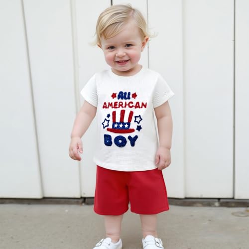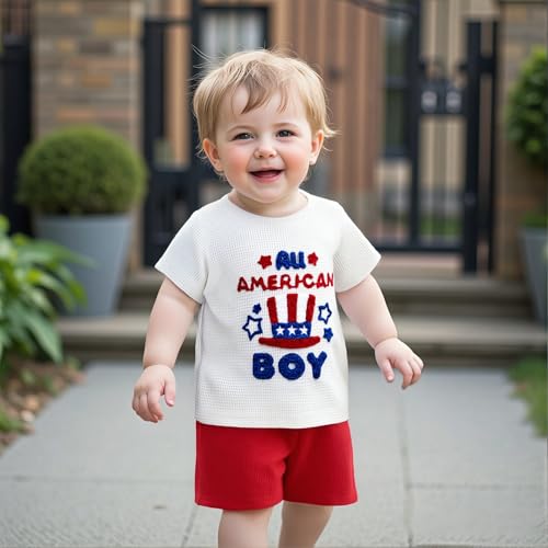sizzling ! Toddler Baby Boy 4th of July Outfit American Flag Embroidery Waffle Knit T Shirt Shorts Set Patriotic Clothes