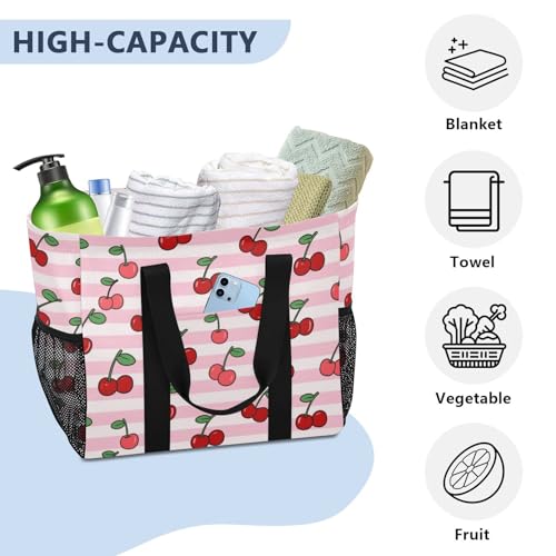 Pink White Striped Fruit Cherry Utility Tote Bag For Women Collapsable Waterproof Canvas Beach Bag Tote