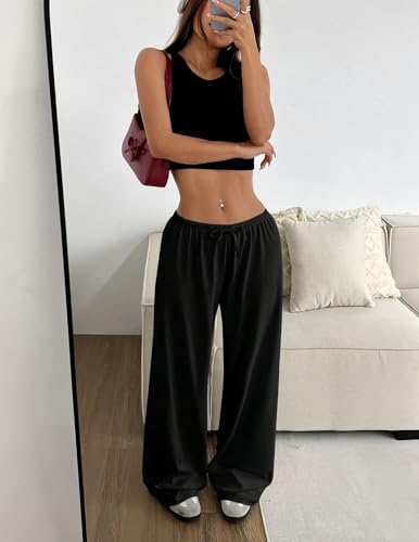 More information about Women’s Solid Color Wide Leg Pants, Elastic Waist Drawstring Casual Trousers, Loose Fit Lounge Pants for Daily Wear