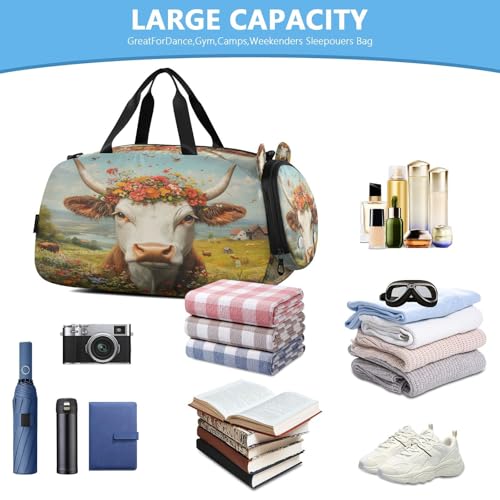 YETTASBIN Sport Travel Duffel Bag for Girls Boys, Cow Flowers Large Waterproof Weekender Overnight Bag, Detachable Shoulder Strap Gym Bag with Shoe Compartment & Wet Pocket