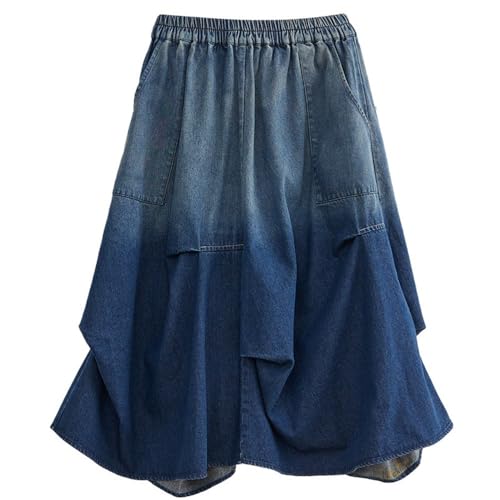Fashion Gradient Color Ruched Midi Denim Skirt for Women Elastic High Waist Casual Loose A-line Skirt with Pockets