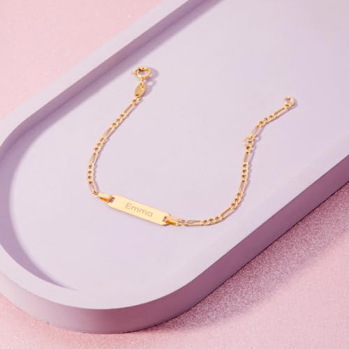 Item display length: 5.5 inchesMaterial: MetalMetal type: Yellow GoldClasp type: Spring RingChain type: Figaro Chain, Link ChainGem type: No gemstone14k Gold: This bracelet is crafted in 14k gold and free from nickel, lead or cadmium; Independently lab tested to ensure it is safe for children with sensitive skinBracelet: This delicately crafted engravable bracelet is carefully designed for children with comfort and safety in mind; This engravable bracelet can be engraved for any young wearer, and also includes an extension for extra comfort on the wristBracelet Length: 5.5 inches (14 cm) - Adjustable to 4.5 inches (11.5cm); Engravable tag ID bracelet (plain rectangle); recommended for ages 6 months - 6 yearsLab-Tested: This bracelet is third-party lab tested and compliant with the Consumer Product Safety Improvement Act (CPSIA) and ASTM F2923, (Standard Specification for Consumer Product Safety for Childrenβs Jewelry)Designed For Children: This bracelet is carefully created with children in mind, prioritizing safety and quality, ensuring the comfort of children throughout the day with appropriate sizing faultless for everyday use. excellent materials and excellent craftsmanship ensure long-lasting durability.