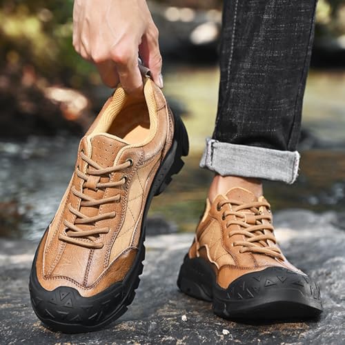 Sole material: Leather-and-rubberOuter material: LeatherClosure type: Lace-UpWater resistance level: Waterproof【Upper Material】: The upper is made of a combination of cowhide and mesh, and the supple and breathable lining keeps your feet dry and refreshed.【Anti-collision toe cap】: Anti-wear plate provides protection on uneven surfaces; high-wear rubber toe cap protector is more durable. The heel is wrapped with synthetic rubber to provide better support and reduce injuries.【Anti-slip outsole】: This men's work shoe adopts an anti-slip rib outsole design, which adds anti-slip grooves to ensure grip performance on mountain and snowy roads, and maintain excellent grip for you in wet and greasy conditions.【Applicable Occasions】: Designed for daily work and outdoor sports, such as hiking, walking, camping, mountaineering, cycling, fishing, backpacking, hiking, climbing, traveling, etc.【Precautions and Services】: Please measure and purchase according to the size chart we provide. If there are any problems during transportation, please contact us as soon as possible. Perfect for everyday use. supreme materials and excellent craftsmanship ensure long-lasting durability.