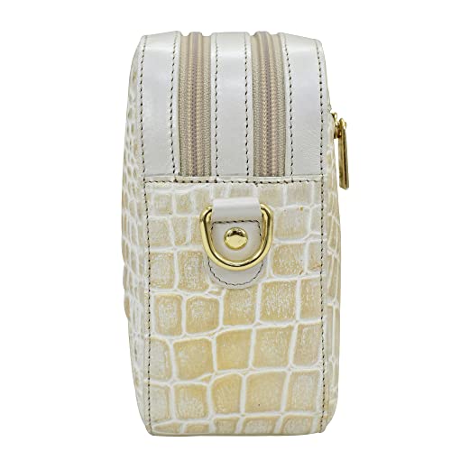 Fabric type: LeatherOrigin: ImportedClosure type: ZipperHAND-PAINTED LEATHER HANDBAGS FOR WOMEN - An original handcrafted accessory that is actually hand-painted onto supple leather (not printed). The skilful hand-painting technique gives the surface a rich, luminous quality ensuring every piece is one-of-a-kindCROCO EMBOSSED - The elegant texture adds rich tactile depth and character to each accessory. This piece comes to life with a layered palette of colors that form a subtle shift in tone, creating a rich surface detail with a stunning iridescent hueHANDCRAFTED FROM LEATHER - Our products are made in India from 100% genuine cowhide full-grain leather, which boasts a soft and luxurious feel. Each piece is cut by hand and handpainted, providing a personal touch and quality that will last a lifetimeFUNCTIONAL DESIGN - Designed for both beauty and form, each bag features a two zippered compartments, pop-up RFID protected card case, zippered wall pocket, rear zippered pocket, and a 26 removable strapDIMENSIONS - Width: 9.5”/24.13cm, Height: 7”/17.78cm, Depth: 3”/7.62cm Perfect for everyday use. premium materials and excellent craftsmanship ensure long-lasting durability.