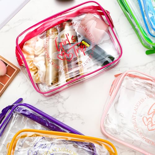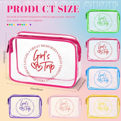 • Vibrant Girl Themed Design: this set includes 6 colorful clear makeup bags (purple, rose pink, blue, green, yellow, and magenta) featuring "Girls Trip" prints, symbolizing friendship and fun; Nice as girls trip gifts favors for bachelorette parties, bridesmaids, or weekend getaways with besties