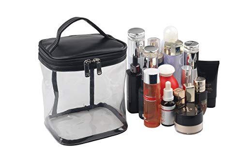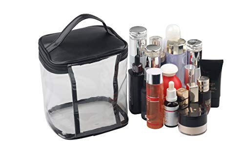 QUALITY MADE - Made from solid and clear PVC material,Reinforced stitching seam and sturdy double zipper make sure this clear makeup bag can bear long term use without tearing on the seamLARGE CAPACITY & DEEP STYLE - Size:5.7x6.7x7.9inch(14.5x17x20cm), very deep, have enough space to storage your makeup and cosmetic accessories, like lipstick, lip gloss, makeup brushes, eyeshadow, makeup palettes, hairbrushes, skin care products, nail polish, nail art tools, shampoo and so noFIND ITEMS FASTER - Transparent design allows you to see what is stored and where it is. Easily find what you are looking for without wasting timeCONVENIENCE HANDLE & INNER POCKET - Our clear bag has a handle on top for your convenience. And a extra inner pocket for your small itemsMULTIPURPOSE - The cosmetic box not only can ensure the safety and organized of cosmetics and tools, but also can be used to store jewelry, electronic accessories, digital cameras, toiletries, essential oils, cosmetics, shaving supplies, etc Perfect for everyday use. excellent materials and excellent craftsmanship ensure long-lasting durability.