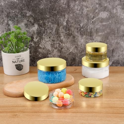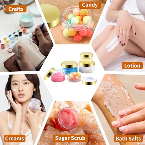 • [MULTIPURPOSE]:This clear plastic round storage jar can not only be used for storing creams, lotions, bath salts, sugar scrubs, fondants, lip scrubs, cosmetics and other items, but it is also suitable for storing dry food, nuts, spices, flour, cute candies, or other handmade products, all of them are a extremely good choice, but it is not recommended to place the objects of higher temperature, you can wait for them to be cooled before storing them.