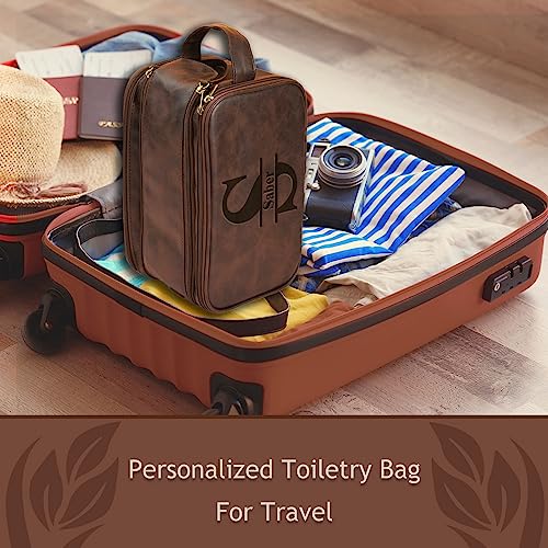 Large Leather Toiletry Bag with Personalized Touch - Add a personal touch to the toiletry bag by customizing it with name, monogram or initials. It's a thoughtful and personalized gift idea for groomsmen, best man, Father's Day, wedding, birthday, husband, and grandpa.Premium Quality Craftsmanship - Our leather toiletry bag with name is crafted with meticulous attention to detail, using high-quality PU Leather. The durable leather construction ensures long-lasting use, while the smooth finish adds a touch of elegance.Large Capacity & Practical Design - The men's dopp kit bag is designed for travel convenience. It features three main compartments, many zipper or mesh pockets inside and elastic straps inside to efficiently organize toiletries and grooming essentials. Sturdy zipper closure ensures secure storage.Gift-Worthy Attributes - This personalized toiletry bag is a perfect gift for various occasions. Its customized nature adds a sentimental value, making it an ideal gift for special men in your life. It's a sophisticated and functional accessory that will be appreciated and cherished.Versatile Usage - Whether for business trips, vacations, or daily grooming routines, this toiletry bag is a reliable travel companion. It keeps toiletries organized and easily accessible, making it suitable for both travel and home use. Perfect for everyday use. excellent materials and excellent craftsmanship ensure long-lasting durability.