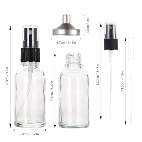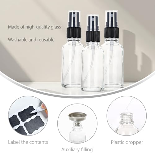 Brand: ALIFEIAColor: TransparentMaterial: GlassCapacity: 30 MillilitersRecommended Uses For Product: Perfume, Cleaning Solution, Essential Oil, Face Spray, Body Spray, Hair Moisturizing SprayPackage Contains: 3 x 1 oz Empty Transparent Glass Bottles;4 x Spray Nozzles; 4 x stickers; 1 funnel; 1 dropper.Material: Our transparent glass spray bottles are made of excellent thickened glass material and are produced at ultra high temperatures. Ideal for daily liquid dispensing spray use.Leak Proof Design: Our glass spray bottle nozzles is made of high quality PP material. The spray nozzles of our glass spray bottle is leak-proof, whether it is used for travel or daily indoor use, it will not leak.Easy to Identify and Store:Transparent glass spray bottles make it easy for us to identify the contents of the bottle and take them out. They are suitable for DIY liquid storage.A Variety of Uses: Our glass spray bottles are suitable for cleaning, essential oil, aromatherapy, rose water, face spray, body sprays, hair moisturizing spray. faultless for everyday use. High quality materials and excellent craftsmanship ensure long-lasting durability.