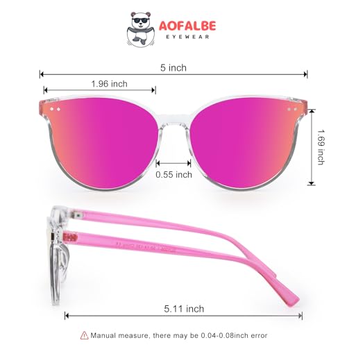 Care instructions: Clean with a soft cloth, avoid high heat, store in a protective case when not in use.Origin: Imported【Super cute & modern design】This pink mirrored kids sunglasses with candy colored stylish shades, are children's best choice for outdoor activities. These cute sunglasses for kids are durable, stylish and lightweight. Our little girl sunglasses are adorable gifts for your kids to suit their daily fashion needs.【Protect your kid’s eyes】The reflective lens of the kid sunglasses are coated by UVA & UVB protection. Our UV400 protection girls sunglasses do great job at protecting children’s eyes and helping cut down the glare from the water. The toddler sunglasses are well made and comfortable for the kids to wear all day.【Durable & premium】The kids sunglasses girls are made from UV400 protection lenses, one-piece nose pads, high-quality PC frames and reinforced metal hinges. All the details will ensure your kids wear our kids sun glasses comfortably without pressure on face or nose. Our baby sunglasses are good for everyday use.【Light weight & Comfortable】Our fashion girl sunglasses are made from super light & skin-friendly material. The cute sunglasses for girls are suitable for any face and easy to stay on, the child will not feel tired after wearing our children sunglasses all day. gafas de sol niños【Excellent Gift】This must be the best gift for your lovely kids, all AOFALBE customers enjoy free-risk shopping, if you are not completely satisfied for any reason after the purchase of our sunglasses for boys girls, please feel free to contact us, we will provide the best service, you have no risk to try! Perfect for everyday use. High quality materials and excellent craftsmanship ensure long-lasting durability.