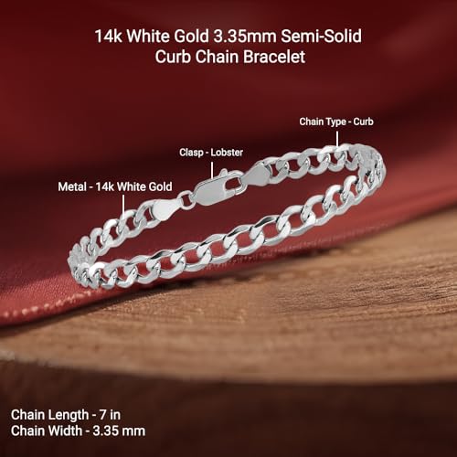 • PRODUCT DETAILS:- Material: Primary - Purity:14K|Finish:Polished|Length of Item:7 in|Plating:Rhodium|Chain Length:7 in|Chain Type:Curb|Chain Width:3.35 mm|Clasp /Connector:Lobster|Feature:Semi-Solid|Manufacturing Process:Casted|Width of Item:3.35 mm|Jewelry Type:Bracelets|Bracelet Type:Chain Styles|Material: Primary - Color:White|Feature 2:Lightweight|Manufacturing Process 2:Machine Made