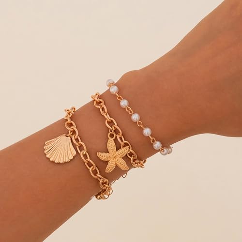 sizzling ! Boho Gold Starfish Sea Shell Pearl Bracelets for Women Trendy, Statement SeaShell Star Beachy Chain Bracelet Beach Ocean Party Holiday Jewelry Gifts