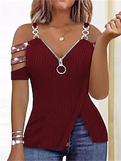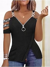 Highlights [Fabric & Fit] This chic women's blouse is crafted from a micro-elastic polyester fabric, ensuring both comfort and a flattering regular fit. The ribbed knit texture adds to its style and versatility, making it an easy-to-wear piece for various occasions. [Design Highlights] Featuring a trendy off-shoulder style with strappy detailing on the shoulders, this top is enhanced by metallic rings and embellishments for a touch of sparkle. The deep V-neck is complemented by a bold zipper, adding an edgy flair, while the asymmetrical hemline gives it a up-to-date and chic aesthetic. [Occasion] outstanding for casual outings or any event where you're looking to make a fashion statement, this versatile blouse can transition seamlessly from a summer day to an evening night out. [Size Availability] Available in a range of sizes from S to 2XL, catering to various body types and preferences. [Color Options] Choose from a selection of vibrant colors, including Black, Red, Pink, and Navy Blue, to suit your personal style.