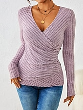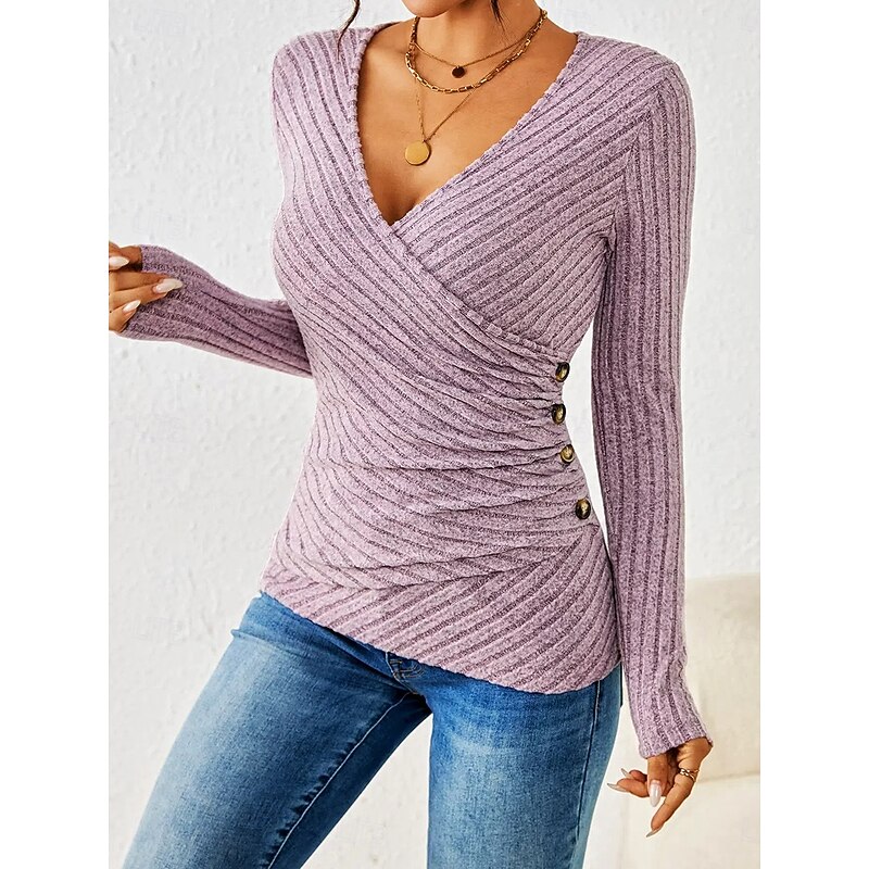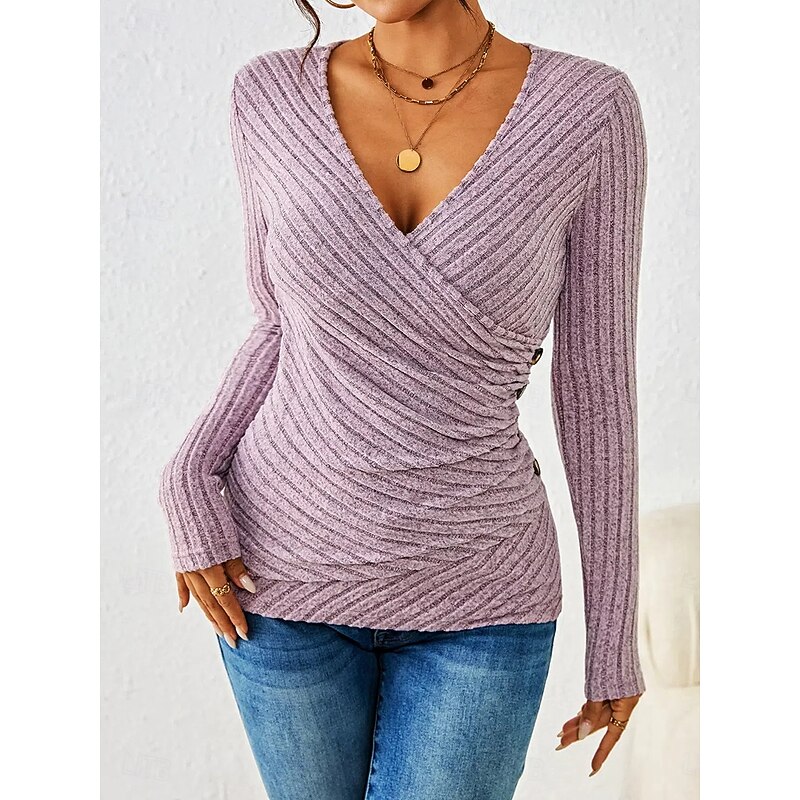 Highlights [Fabric] : Crafted from a soft ribbed knit polyester, this women's blouse offers a micro-elastic fit, promising both comfort and a flattering silhouette. The material is ideal for maintaining warmth during the cooler fall and winter seasons while providing a sophisticated touch. [Style] : This blouse showcases a chic wrap design with a V-neckline, enhancing its basic yet versatile appeal. The regular fit and regular length make it suitable for casual, everyday wear, ensuring you stay fashionable and comfortable. [Design Highlights] : The blouse features elegant side buttons that accentuate the wrap-around style, adding a unique and sophisticated element to the overall look. The long sleeves provide additional warmth, making it a perfect choice for fall and winter outings. [Occasions] : Ideal for daily wear, this top can be effortlessly paired with jeans or a skirt for a chic, casual ensemble. It's suitable for various occasions such as casual outings, relaxed gatherings, or any day when you want to add a touch of elegance to your look. [Size Range] : Available in a wide range of sizes from S to 2XL, this blouse caters to diverse body types. Choose the size that best fits your needs to enjoy its flattering and comfortable fit. Perfect for everyday use. excellent materials and excellent craftsmanship ensure long-lasting durability.