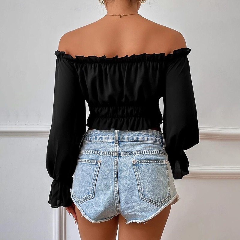 Highlights Blouse Highlights [Fabric] : Crafted from a lightweight polyester fabric, this women's blouse is designed to offer comfort and micro-elasticity, making it perfect for everyday wear in spring and fall. The breathable material ensures ease and style in a variety of settings. [Fit] : The blouse features a regular fit that is both fashionable and functional, making it an essential piece for street and daily fashion. Its relaxed silhouette ensures versatility, allowing it to complement different outfits and body types. [Design Highlights] : This modern off-shoulder crop top boasts an elegant plain black design. The ruffled edges of the neckline add a touch of femininity, while the flared long sleeves introduce a bohemian flair. The elasticized hemline gently hugs the waist, enhancing the wearer's silhouette effortlessly. [Occasions] : Ideal for street style and daily outings, this blouse is perfect for casual outings, summer festivals, or simply enjoying a day at the beach. Pair it with denim shorts for a trendy summer look or with tailored pants for a more polished appearance. [Size Range] : Available in various sizes—S, M, L, and XL—this blouse caters to a wide range of body shapes and personal styles, ensuring every woman can find her perfect fit. Perfect for everyday use. premium materials and excellent craftsmanship ensure long-lasting durability.