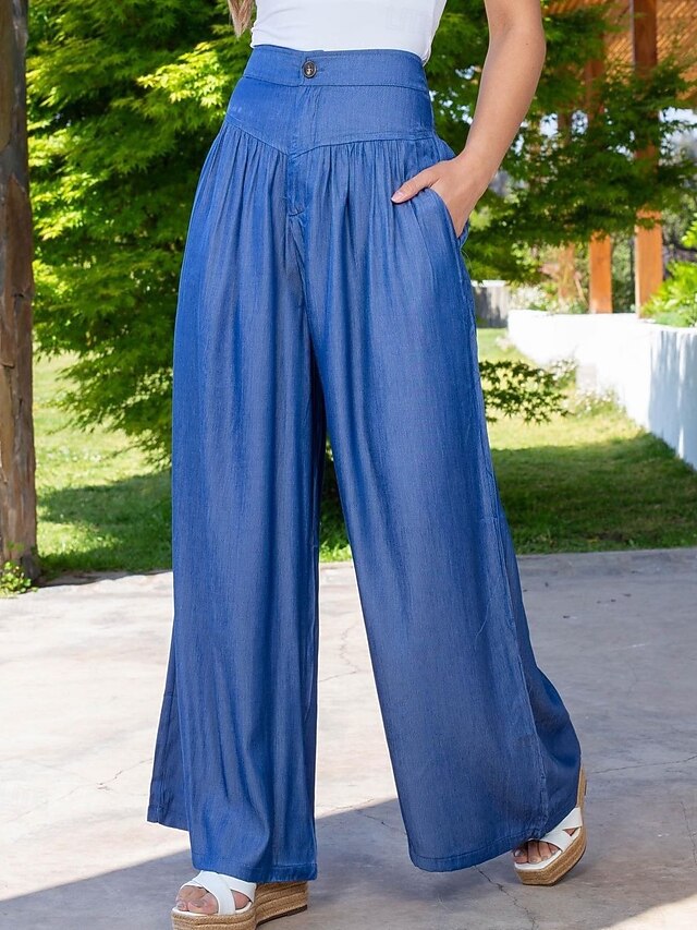 sizzling ! Women's Wide Leg Slacks Casual Full Length Natural Plain Side Pockets Comfy Breathability Casual Daily Blue Light Blue Spring Fall Loose Fit