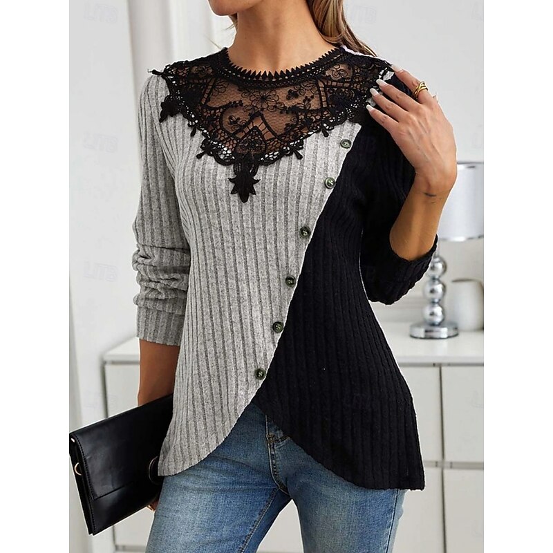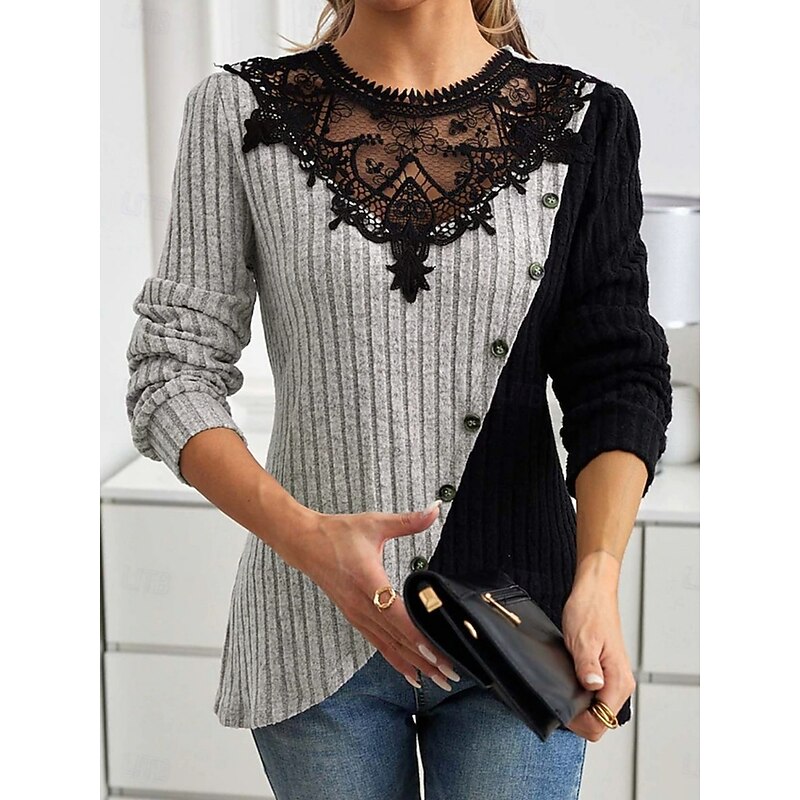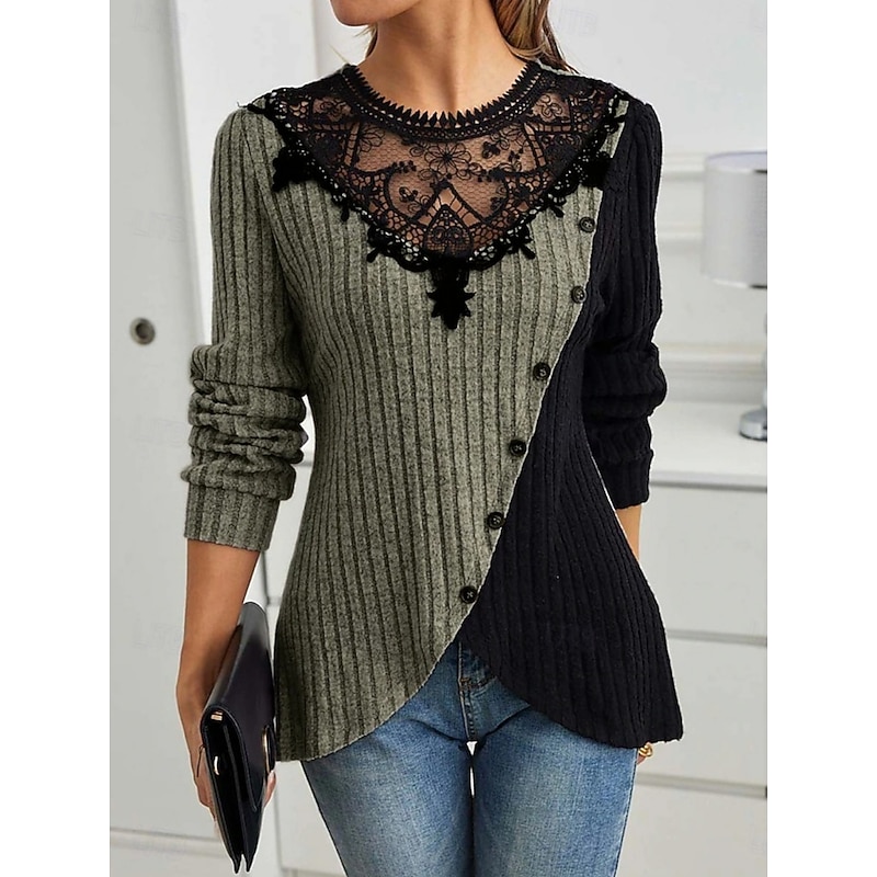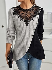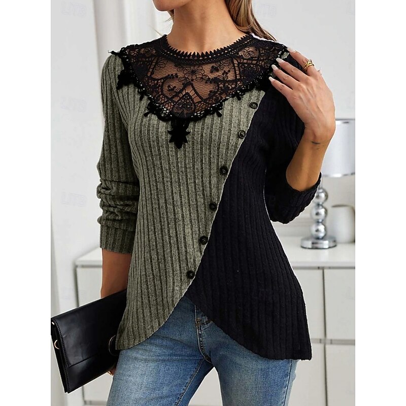sizzling ! Women's Blouse Solid Color Elegant sophisticated Basic Long Sleeve Crew Neck Regular Tops Daily Lace Patchwork Army Green Light Purple Light Grey Spring Fall Winter