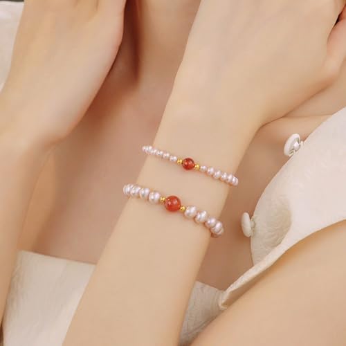 sizzling ! 4.5/6.5mm Pearl Bracelet 18K Gold Bead Pink Purple Freshwater Pearl Stretch Beaded Bracelet Red Agate Bead Bracelet for Women Lady 6.7"/17cm