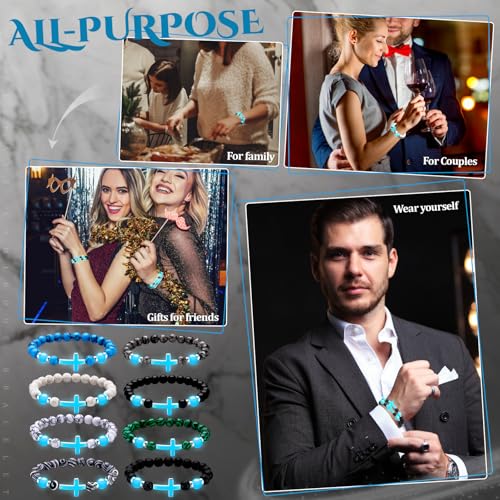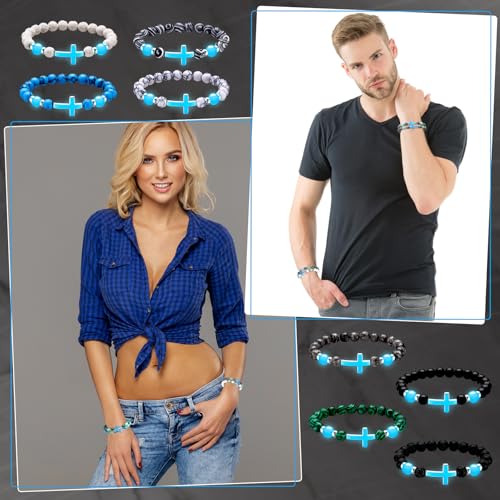• Elegant Versatility: the religious luminous cross stretch bracelet applied 8mm round beads is cushy design; With an adjustable size starting from a minimum diameter of 2.16 inches, it suits both men and women; The inclusion of stunning natural stones like volcanic stone, white turquoise, and blue line turquoise ensures the bracelet can accompany you from daily wear to special occasions, adding a touch of elegance and charm wherever you go