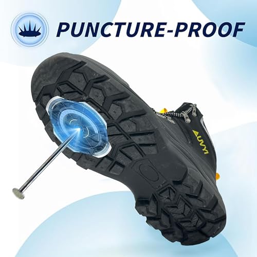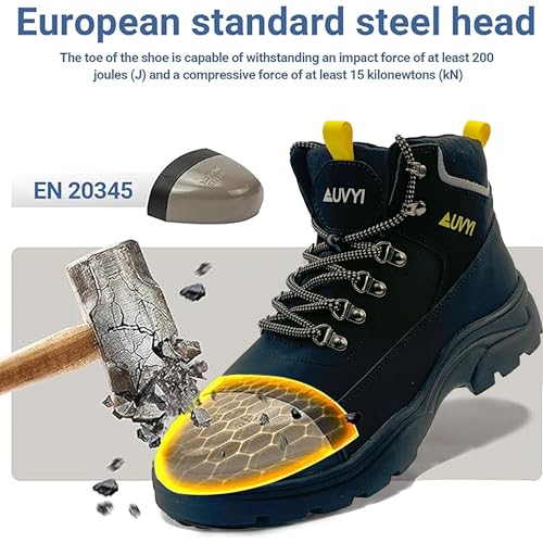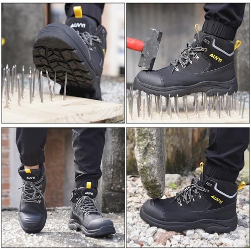 Sole material: RubberOuter material: LeatherClosure type: Lace-UpWidened Steel Toe Protection:These men's work boots feature a widened European-standard steel toe that provides extra room and comfort while offering greater protection than the ASTM standard. It helps reduce toe pressure and guards against impact or compression injuries.Waterproof Synthetic Upper:Crafted from high-quality waterproof synthetic leather, the upper keeps your feet dry and protected in wet conditions. Paired with a breathable mesh lining, it ensures comfort in various weather and work environments.Enhanced Puncture Resistance:A 4.0mm thick Kevlar midsole offers stronger puncture protection than standard safety boots, effectively shielding your feet from nails, sharp metal fragments, and broken glass commonly found on job sites.Anti-Fatigue Cushioning Insole:Designed with a plush, shock-absorbing insole featuring high-resilience foam and gel pads, these boots reduce foot fatigue and provide lasting comfort and support during long work hours.Slip-Resistant Traction:The durable rubber outsole delivers reliable grip on wet, oily, or uneven surfaces. Its anti-slip tread design enhances stability, helping you stay safe and confident in tough working conditions. Perfect for everyday use. excellent materials and excellent craftsmanship ensure long-lasting durability.