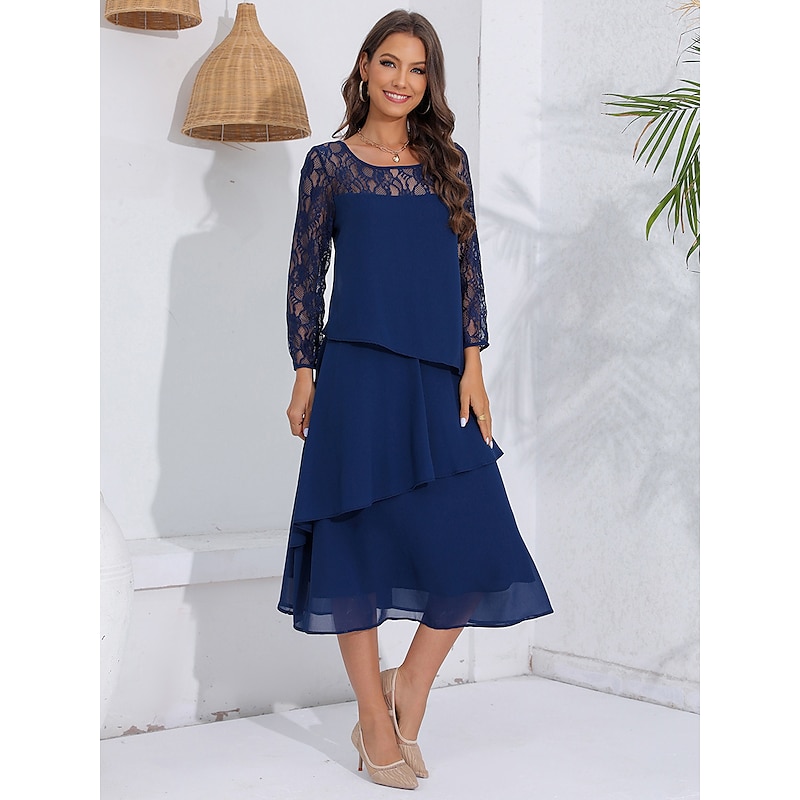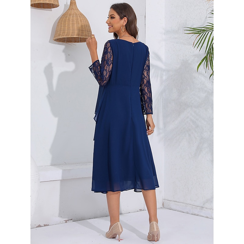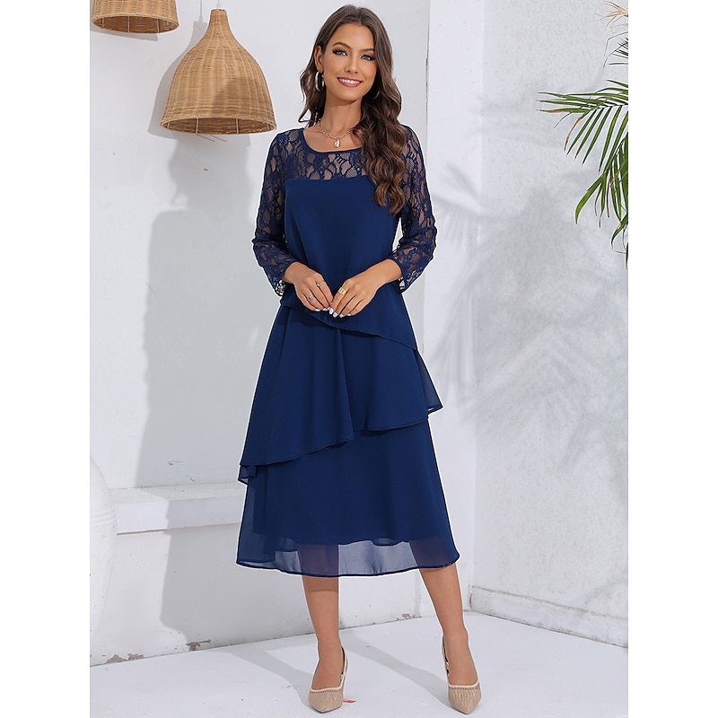 sizzling ! Women's Wedding Guest Cocktail Dress Lace Ruffle Elegant Vacation Spring Winter Midi Dress Crew Neck Long Sleeve Navy Blue