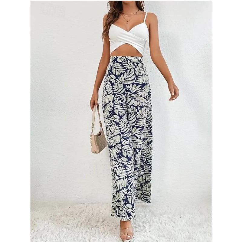 Women's Wide Leg Pants Trousers Casual Daily Long Leaf Wide Leg Print Breathability pleasant Micro-elastic Going out Weekend Dark Blue Spring & Summer Regular Fit