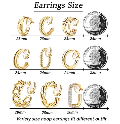 FASACCO Gold Clip on Earrings Retro Gold Chunky Hoop Clip Earrings Twist Triple CZ Clip on Hoop Earrings for Women Non-Pierced Fake Earrings, 9Pairs
