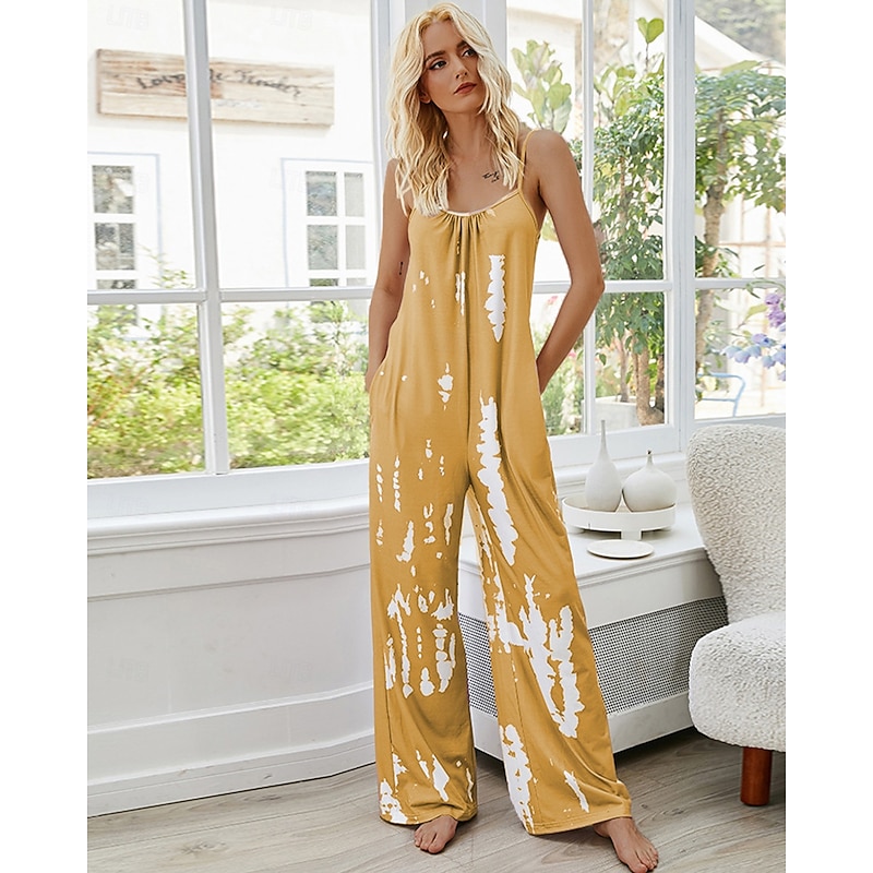 Highlights [Fabric] : Crafted from a soft blend of polyester and spandex, these women's pajamas feature a breathable and lightweight fabric that ensures maximum comfort. The materialβs stretchiness provides a flexible fit, ideal for relaxed lounging at home. [Fit] : These pajamas boast a comfortable, relaxed fit with a wide-leg cut for easy movement and a laid-back style. The long pants offer coverage and coziness, making them suitable for various temperatures throughout the year. [Design Highlights] : Showcasing a chic tie-dye pattern available in blue, green, pink, and yellow, these pajamas add a playful yet sophisticated touch to your home outfit. The design includes practical pockets and a timeless crew neck, accented by spaghetti straps for added versatility in styling. [Occasions] : Perfect for unwinding at home, whether you're enjoying a peaceful night in bed or a leisurely morning. These pajamas make an excellent choice for home-bound comfort and casual relaxation. [Size Range] : Available in sizes S, M, L, and XL, these pajamas cater to a variety of body types, ensuring a comfortable and personalized fit for every wearer. Perfect for everyday use. supreme materials and excellent craftsmanship ensure long-lasting durability.