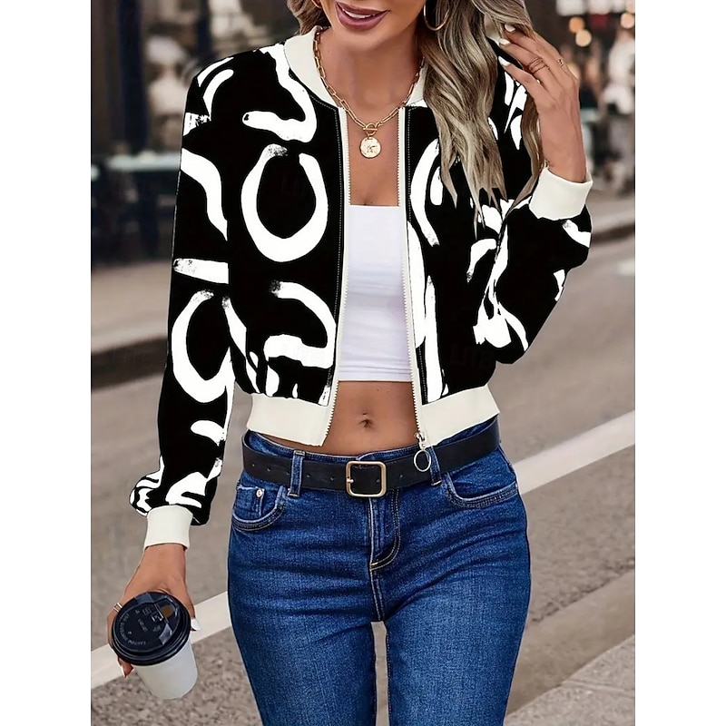 Why Choose Women's Casual Jacket cushy Breathable Zipper Print Casual Street Style Geometric Vacation Street Casual Daily Wear Zipper Short Stand Collar Loose Fit Long Sleeve Outerwear Black White Fuchsia?
