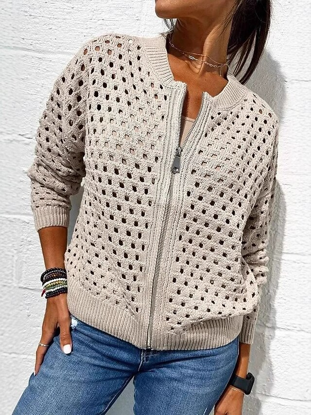 Why Choose Women's Sweater Cardigan Elegant Fashion Streetwear Solid Color Crew Neck Hollow Out Zipper Knitted Long Sleeve Regular Tops Knit Outdoor Daily Weekend Black Pink Spring Fall?