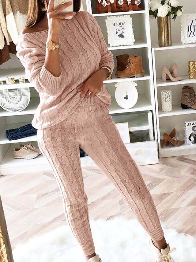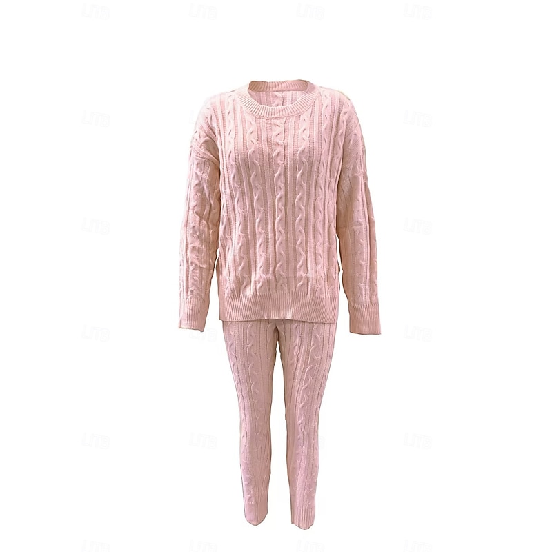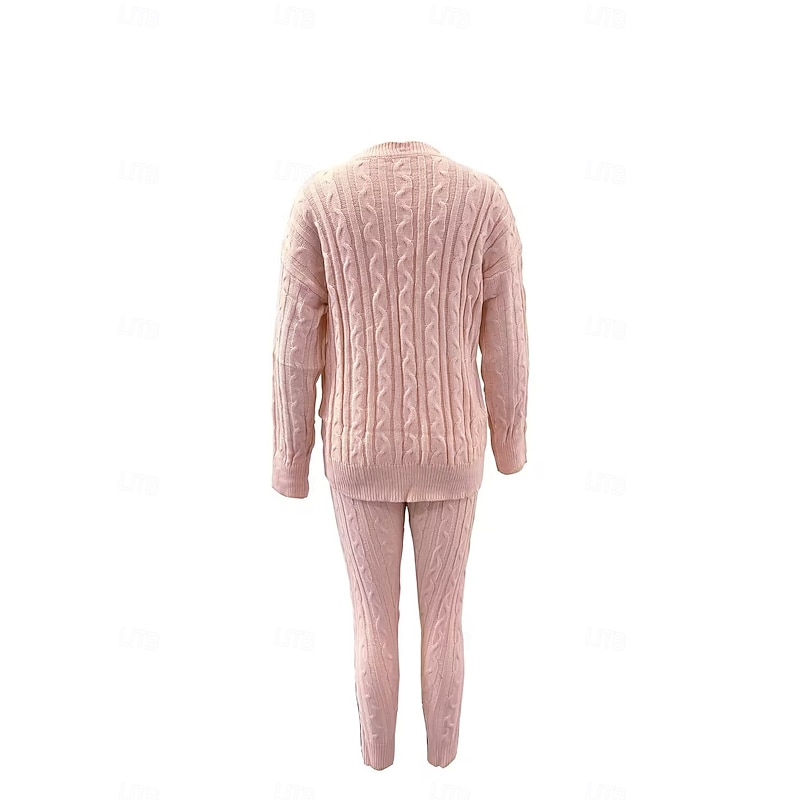 Highlights [Fabric] Crafted from a warm and stretchy cable-knit fabric, this women's sweater offers both comfort and style. The high-quality knit construction ensures both durability and a cozy fit, making it ideal for the cooler fall and winter months. [Fit] This relaxed two-piece set includes a crew neck sweater and matching high-waisted pants. The sweater features a regular fit with long sleeves and ribbed cuffs, providing a snug and comfortable wearer experience. The tapered leg pants complement the top perfectly, with ribbed cuffs at the ankles for a polished look. [Design Highlights] The sweater's design includes an elegant crew neck and intricate cable-knit pattern that bring texture and visual interest to the outfit. The soft blush pink color adds a gentle touch, suitable for any casual yet sophisticated occasion. [Occasions] Perfect for weekend outings and casual gatherings, this set marries style and comfort effortlessly. Whether youβre at home or meeting friends, this ensemble ensures youβre cozy and on-trend. [Size Range] Available in sizes S, M, L, and XL, this sweater set is designed to accommodate a variety of body types for the perfect fit. Perfect for everyday use. excellent materials and excellent craftsmanship ensure long-lasting durability.