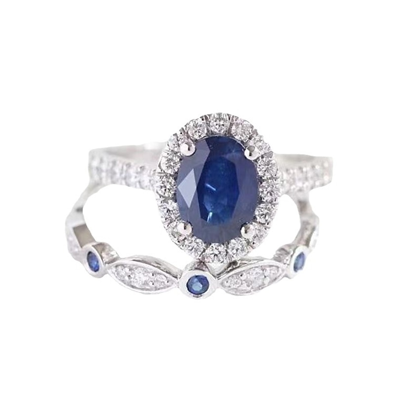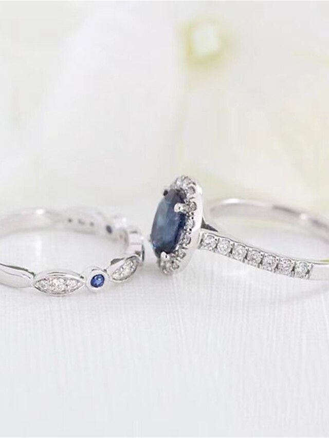 Highlights [**Fabric**] Crafted from high-quality zinc, these rings are designed to offer both durability and a shiny finish. The use of premium materials ensures a robust build while maintaining a sophisticated appearance perfect for everyday wear. [**Fit**] The rings feature a snug fit, available in a variety of sizes to accommodate different preferences. Sizes include Number 5, Number 6, Number 7, Number 8, Number 9, Number 10, and Number 11, providing options for a personalized and comfortable fit. [**Design Highlights**] The centerpiece of this romantic set is a blue sapphire ring with a striking geometric pattern. The main ring showcases an oval-cut sapphire encircled by brilliant white diamonds, adding an exquisite sparkle. The accompanying band features marquise-shaped motifs with smaller sapphires and diamonds, embodying intricate attention to detail and elegance. [**Occasions**] This set is ideal for romantic occasions, such as dates and Valentine's Day. Its blend of up-to-date elegance and vintage charm makes it a versatile choice for any special event, ensuring you stand out with sophistication. [**Size Notice**] Available in sizes Number 5 through Number 11, this ring set offers a range of options to ensure the perfect fit for any wearer.