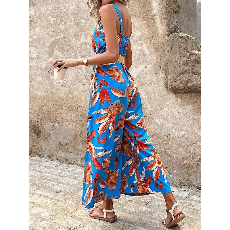 Women's Normal Jumpsuit Holiday Floral Sleeveless V Neck Backless Pocket Street Daily Regular Fit Blue Summer