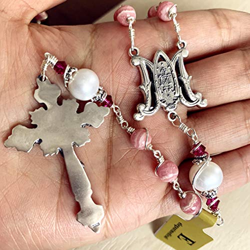 More information about elegantmedical Handmade Sterling Silver Wire Wrapped UNDOUBTED RHODOCHROSITE &10mm Real Pearl Beads Rosary Cross/Crucifix Necklace Box Catholic Womens Gift