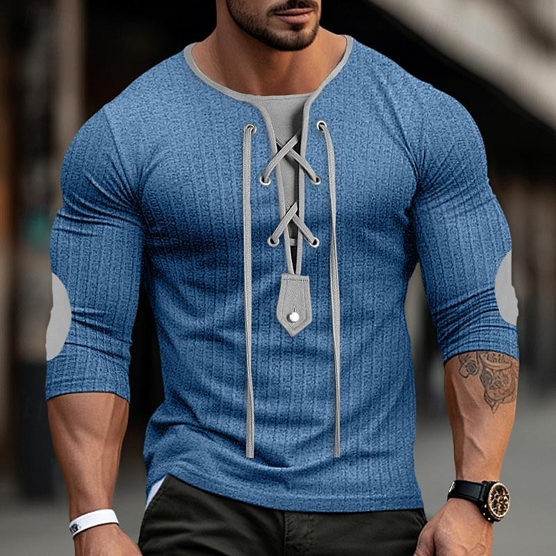 More information about Men's T Shirt Muscle Shirt Ribbed Knit tee Tee Top Long Sleeve Collar Spring & Fall Color Block Pit Strip Fashion Designer Basic Drawstring Patchwork Vacation Street Going out Black White Blue Top