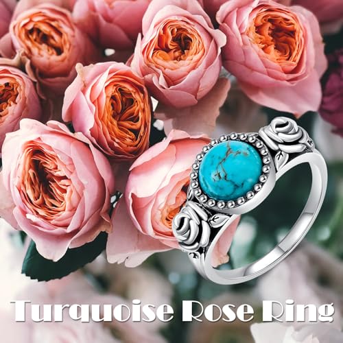 Rose Flower Ring for Women 925 Sterling Silver Genuine Natural Turquoise Vintage Rose Promise Statement Ring Ladies Jewelry Valentines Day Gift for Women Mother